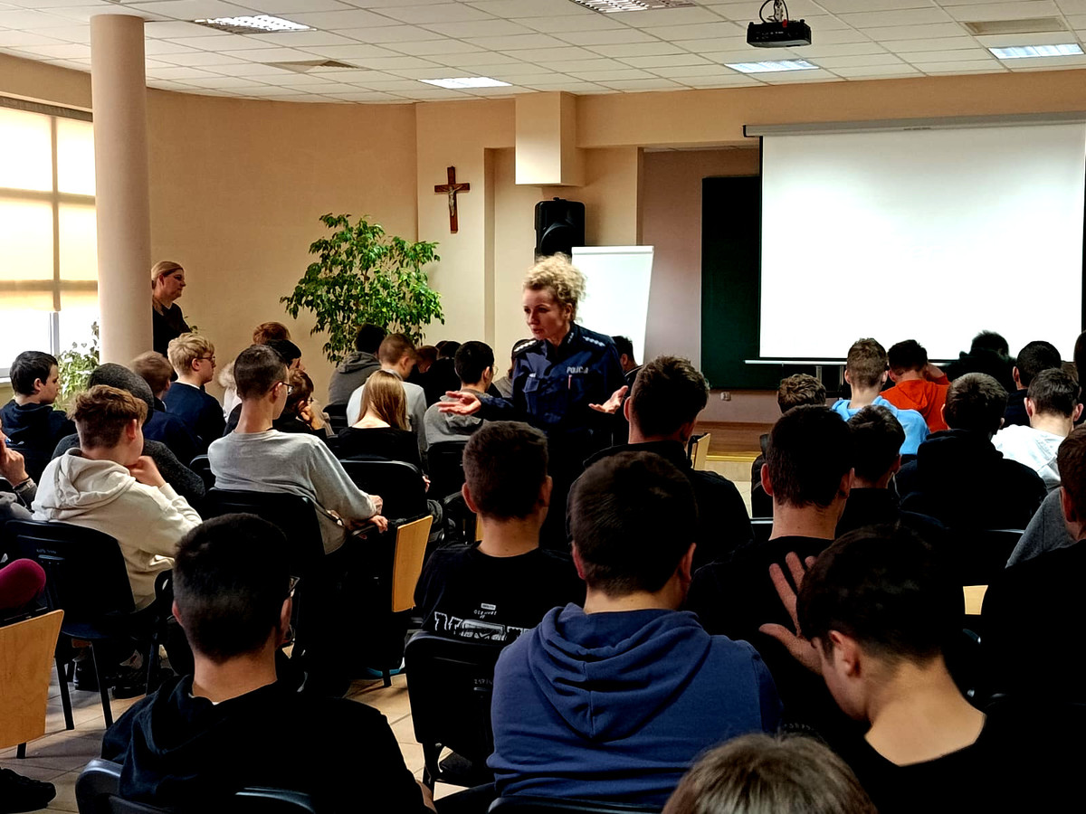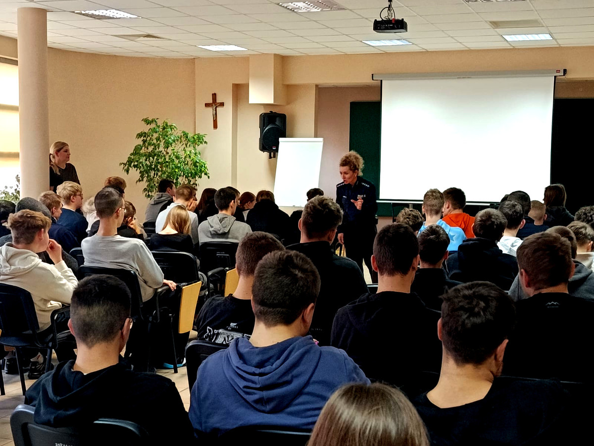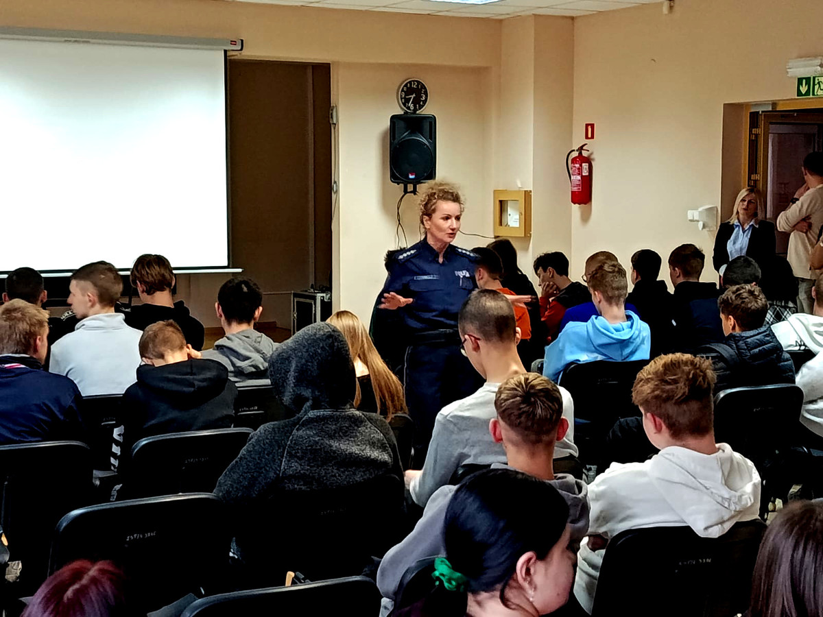 12 listopada 2025 roku policjantka piotrkowskiej komendy spotkała się z uczniami Zespołu Szkół Ponadpodstawowych nr 4 w Piotrkowie Trybunalskim. Podczas pogadanki młodzież usłyszała czym różni się zwykły konflikt od mowy nienawiści i hejtu. Funkcjonariuszka podkreśliła, że internet nie jest przestrzenią anonimową, a treści publikowane w mediach społecznościowych mogą stać się dowodami w postępowaniu prawnym. Asp. szt. Katarzyna Dębińska omówiła skutki psychologiczne, które mogą towarzyszyć ofiarom hejtu, takie jak przewlekły stres, izolacja, poczucie odrzucenia, obniżenie poczucia własnej wartości czy depresja oraz myśli samobójcze. Policjantka szczegółowo wyjaśniła obowiązujące przepisy dotyczące odpowiedzialności prawnej osób małoletnich. Uczniowie dowiedzieli się również, że czyny takie jak kradzież, rozbój, wymuszenia, szantaż, groźby karalne, udostępnianie lub sprzedaż narkotyków, dopalaczy czy alkoholu osobom nieletnim są przestępstwami zagrożonymi poważnymi konsekwencjami, bez względu na miejsce ich popełnienia. W dalszej części spotkania funkcjonariuszka omówiła zagadnienie związane z substancjami psychoaktywnymi, ze szczególnym zwróceniem uwagi na niebezpieczeństwo używania dopalaczy, tabletek eksperymentalnych i marihuany syntetycznej. Zwróciła uwagę, że sprzedaż narkotyków osobom nieletnim jest przestępstwem traktowanym przez prawo szczególnie surowo. Przypomniała, że nawet jednorazowe użycie substancji psychoaktywnych może skutkować trwałymi uszkodzeniami zdrowia, uzależnieniem lub zagrożeniem życia.