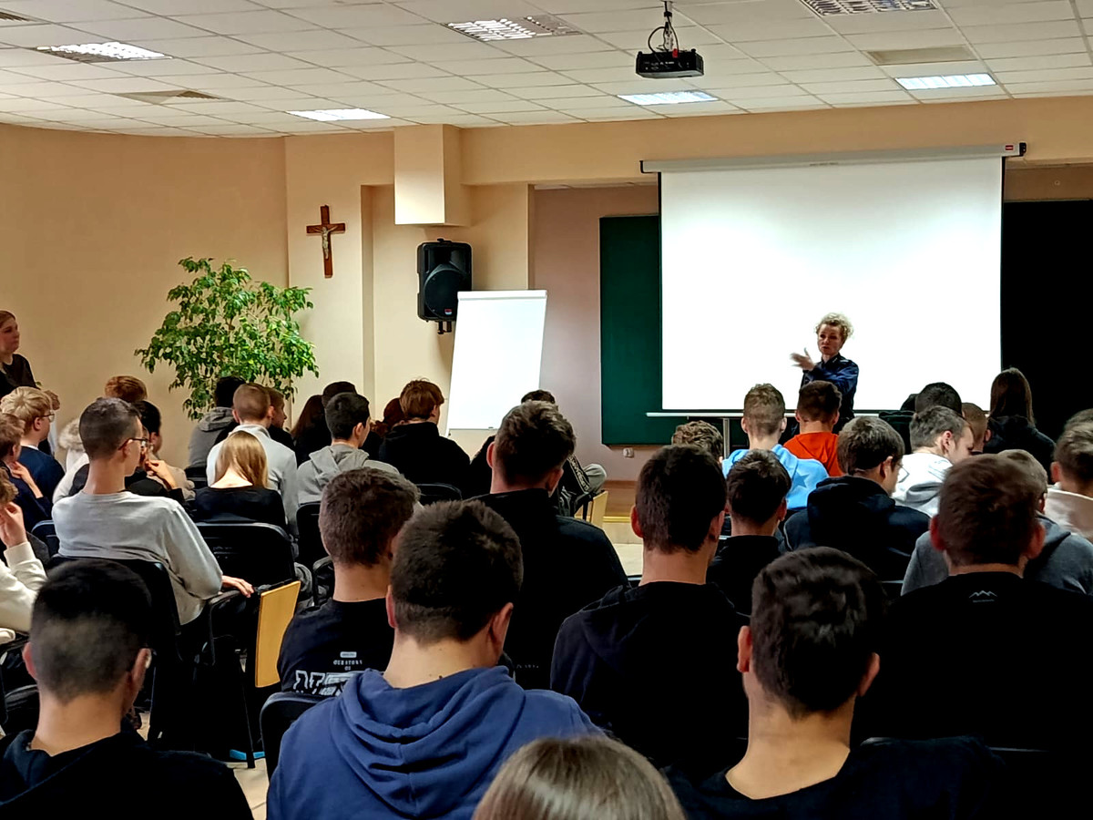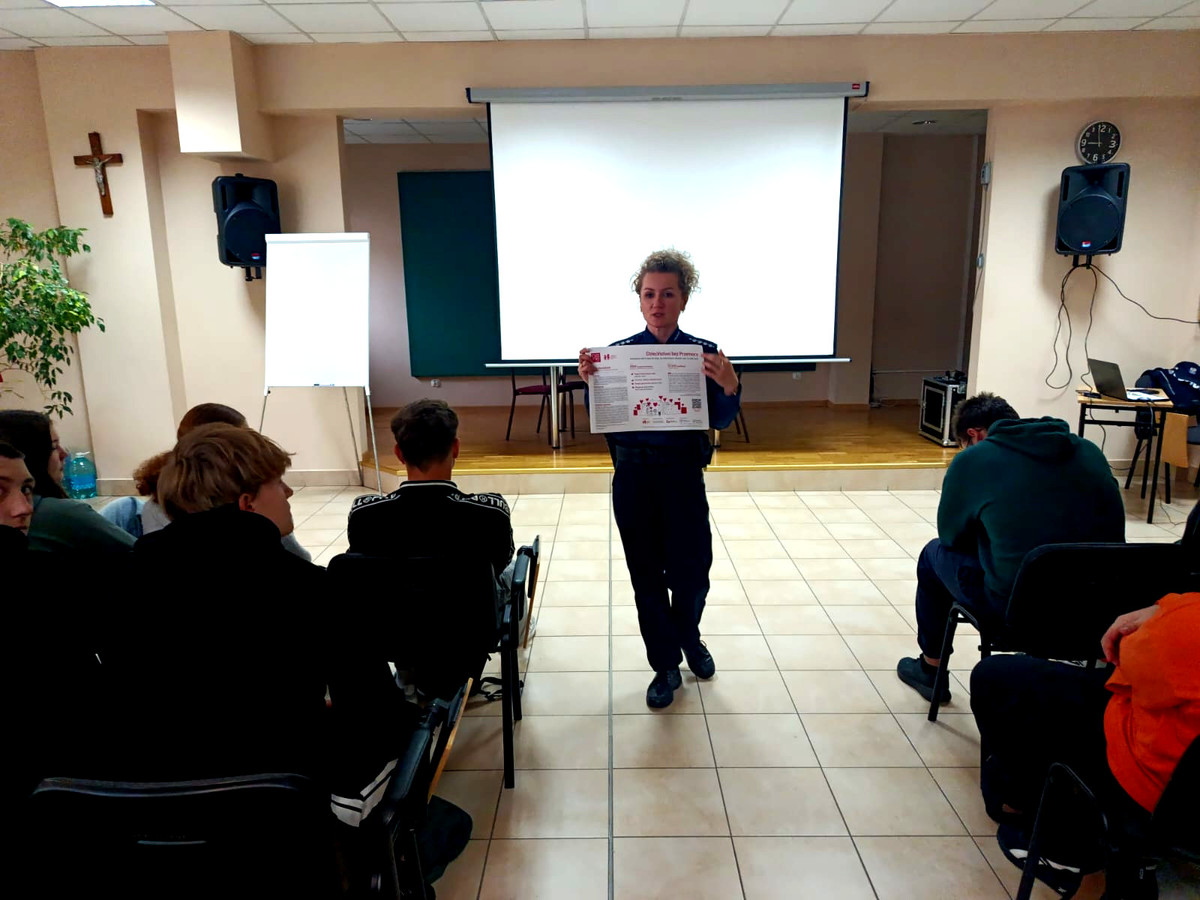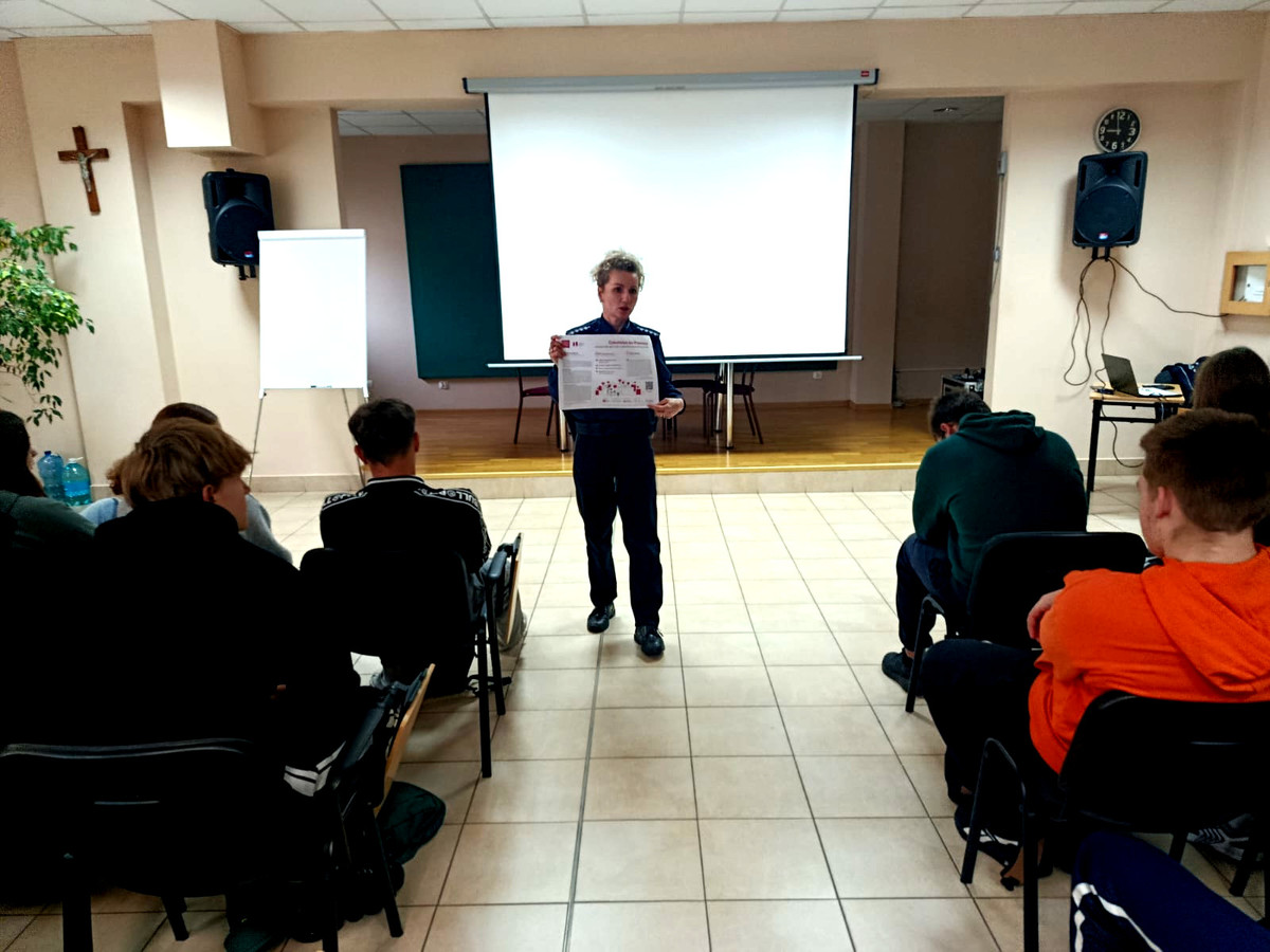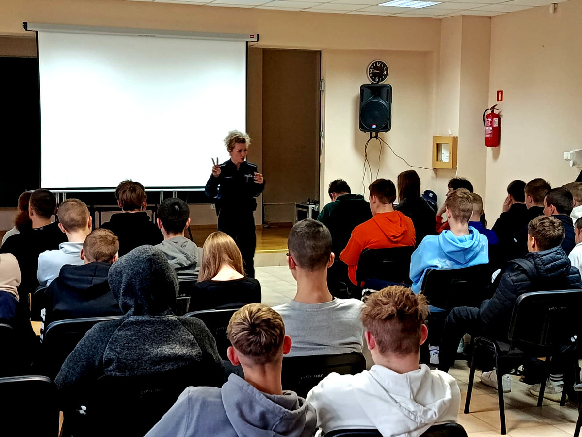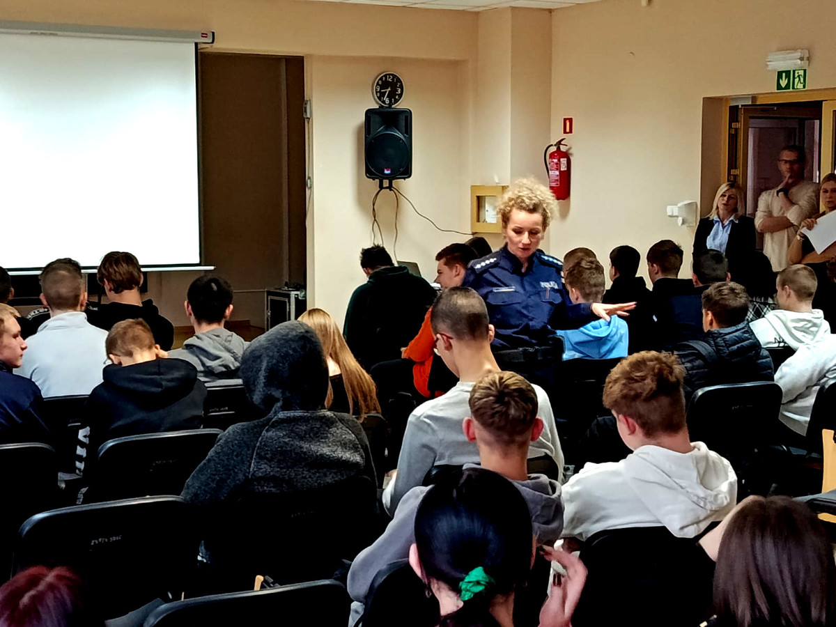 Aspirant sztabowy Katarzyna Dębińska przeprowadziła prelekcję dotyczącą mowy nienawiści, hejtu w internecie oraz konsekwencji prawnych zachowań nieletnich związanych m.in. z przemocą, kradzieżą oraz środkami odurzającymi. Funkcjonariuszka przybliżyła również temat przemocy wobec dzieci.