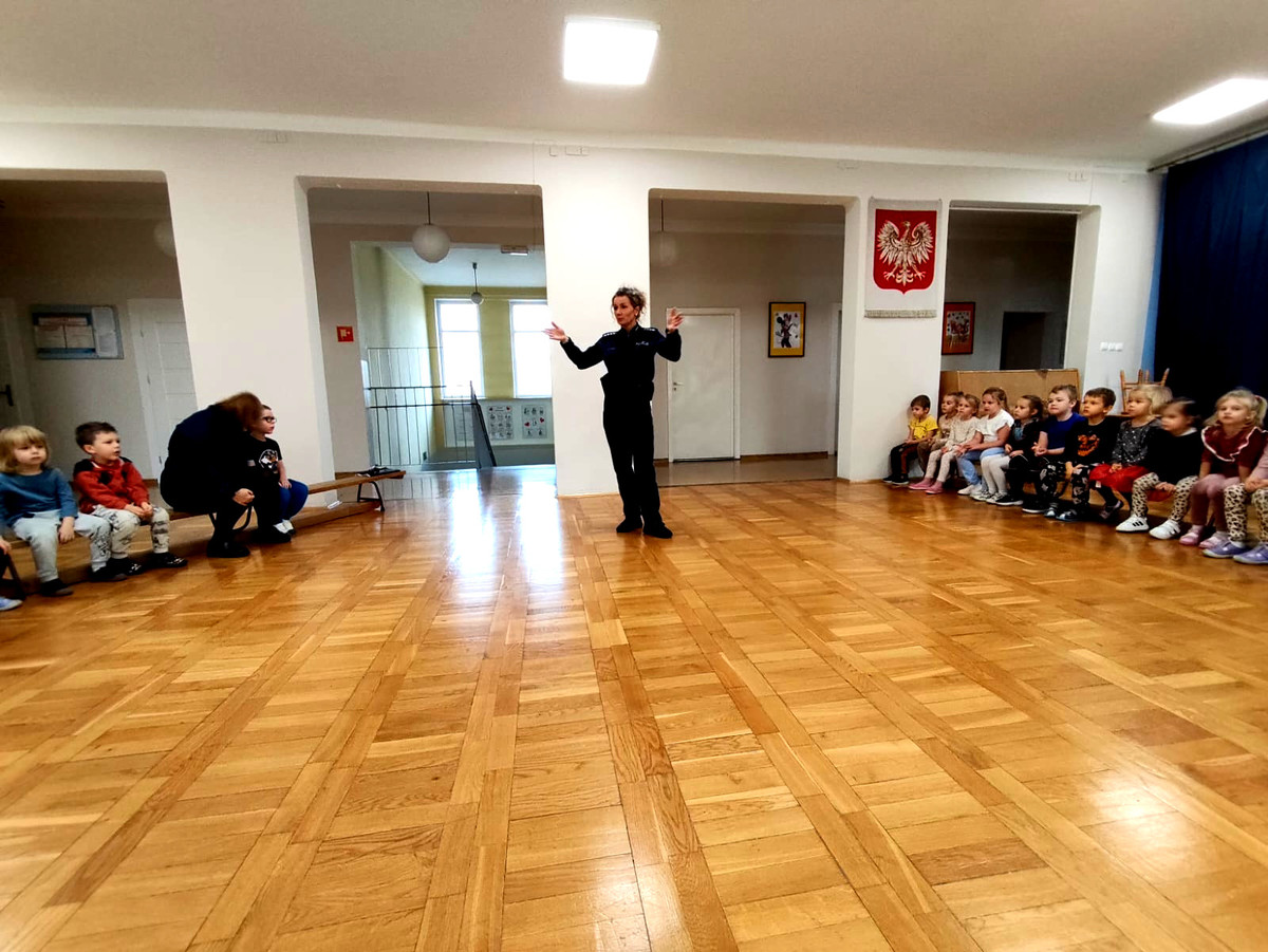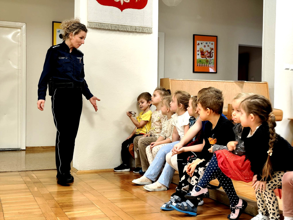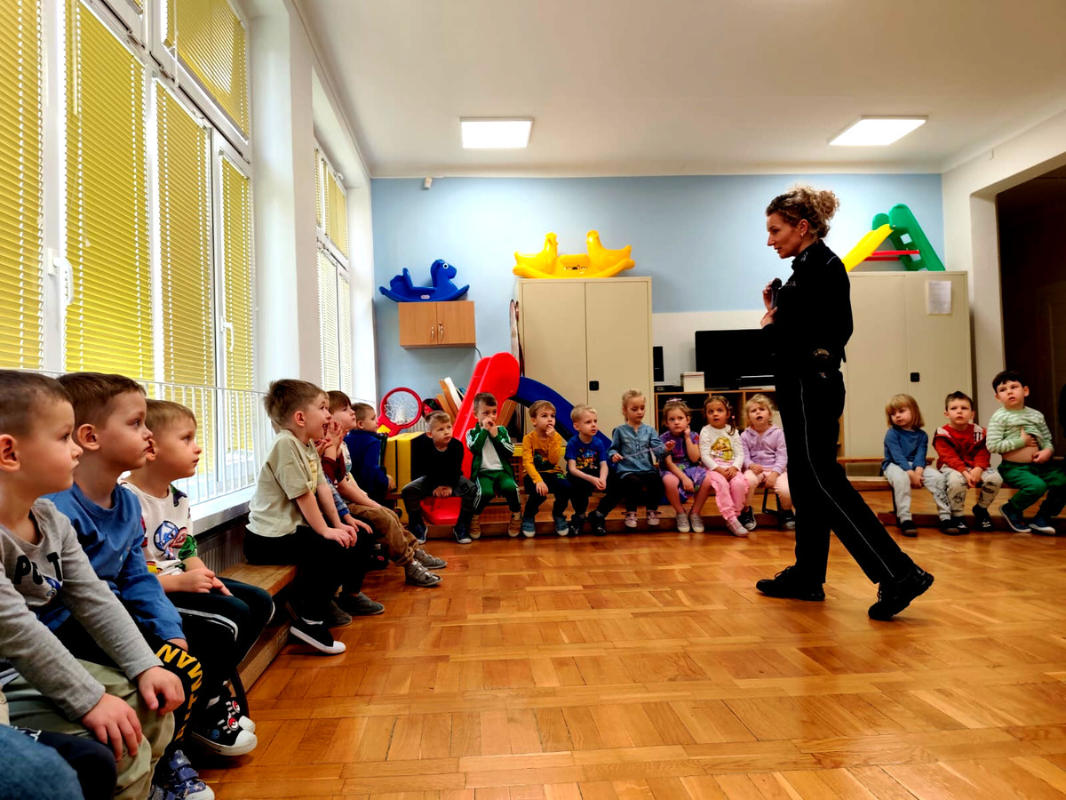 Tego samego dnia odbyła się również prelekcja w Przedszkolu Samorządowym nr 20 w Piotrkowie Trybunalskim. Spotkanie dotyczyło szeroko pojętego bezpieczeństwa. Funkcjonariuszka przypomniała dzieciom podstawowe zasady ruchu drogowego. Omówiła prawidłowe zachowanie podczas przechodzenia przez jezdnię, korzystania z przejść dla pieszych oraz sygnalizacji świetlnej. Przedszkolaki poznały także zasady kontaktu z osobą obcą. Policjantka zwróciła także uwagę na to, jak radzić sobie w sytuacji zagubienia. Przedszkolaki wiedzą już, że muszą zachować spokój, pozostać w miejscu oraz zwrócić się o pomoc do zaufanej osoby dorosłej. Mundurowa przypomniała milusińskim numer alarmowy 112, podkreślając, że dzieci też mogą dzwonić, ale tylko w razie realnego zagrożenia. Podczas spotkania omówiła również pracę policjanta, jego wyposażenie służbowe oraz przeznaczenie poszczególnych elementów umieszczonych na pasie służbowym.