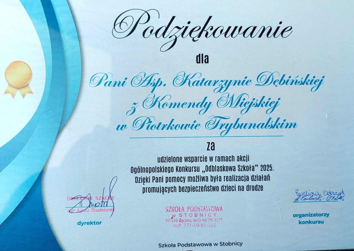 14 listopada 2025 roku w Szkole Podstawowej w Stobnicy odbyło się podsumowanie działań realizowanych w ramach ogólnopolskiego konkursu „Odblaskowa Szkoła” 2025" w którym wzięła udział aspirant sztabowy Katarzyna Dębińska z Komendy Miejskiej Policji w Piotrkowie Trybunalskim. Do udziału z terenu powiatu zgłosiło się 6 szkół podstawowych.