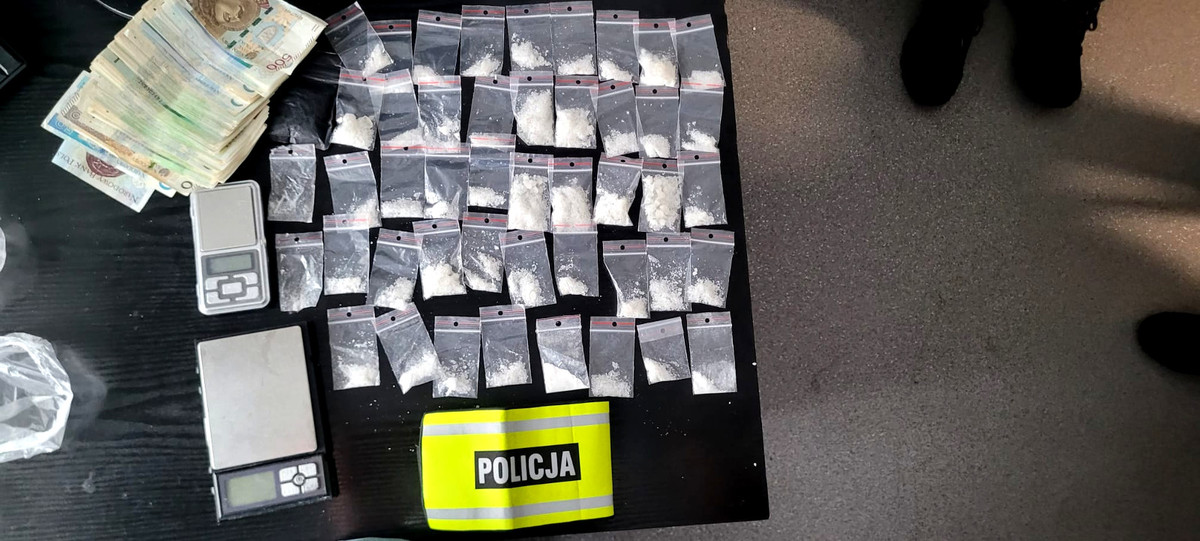 Funkcjonariusze Wydziału Kryminalnego ustalili, że mieszkaniec Piotrkowa Trybunalskiego może posiadać znaczne ilości narkotyków. 27 listopada 2025 roku, pojechali do jednego z mieszkań na ul. Wojska Polskiego. Na miejscu, wykorzystując psa służbowego wyszkolonego do wyszukiwania zapachów narkotyków, przeszukali posesję. W trakcie działań, w pokoju dziennym oraz sypialni, policjanci znaleźli woreczki foliowe z białym proszkiem, dwie precyzyjne wagi, karteczkę z zapiskami oraz ponad 10 tysięcy złotych. Gdy przeszukiwali piwnicę znaleźli 600 sztuk pustych woreczków oraz kolejne z zawartością białego proszku. 47-latek przyznał, że ujawniona substancja w całości należy do niego. Funkcjonariusze zbadali zatrzymaną substancję, tester wskazał wynik pozytywny dla metamfetaminy. W 45 torebkach zabezpieczono niemal 94 gramy narkotyków. Mężczyzna usłyszał zarzut przygotowania do wprowadzenia do obrotu znacznej ilości substancji psychotropowych. Grozi mu kara do 10 lat pozbawienia wolności. Sąd, na wniosek, prokuratora zastosował wobec zatrzymanego areszt na okres 3 miesięcy.