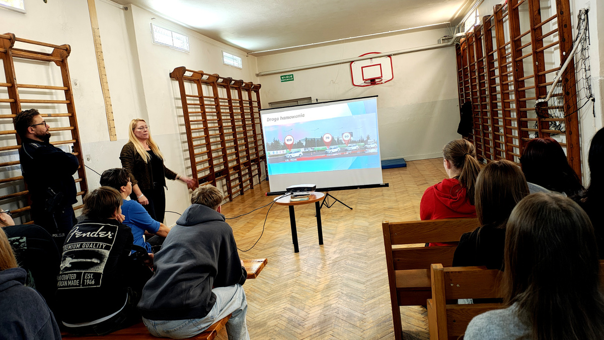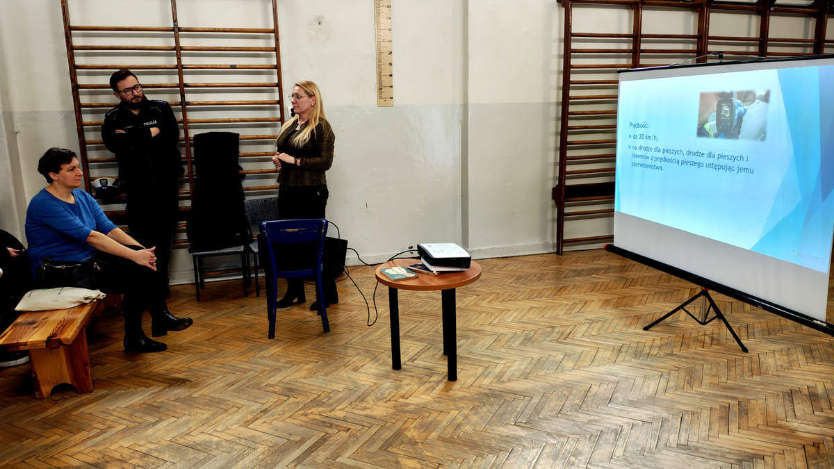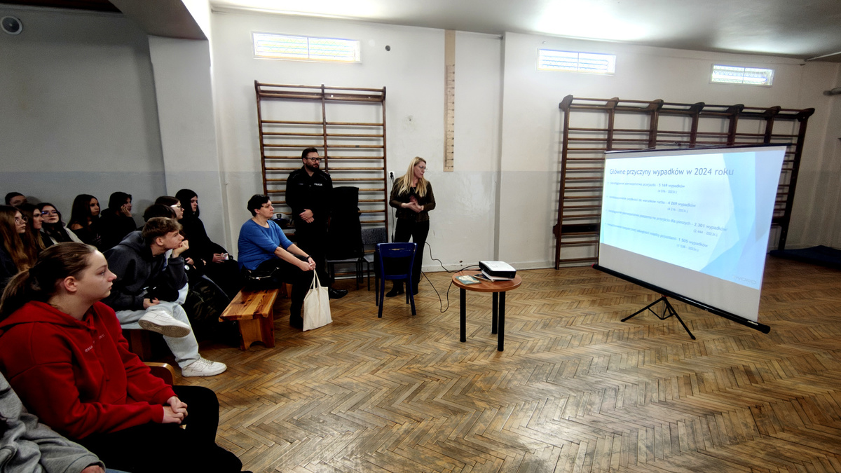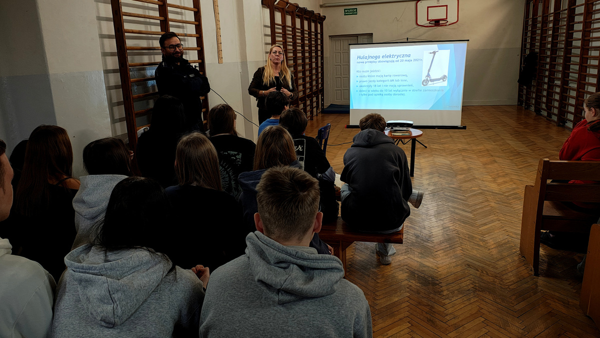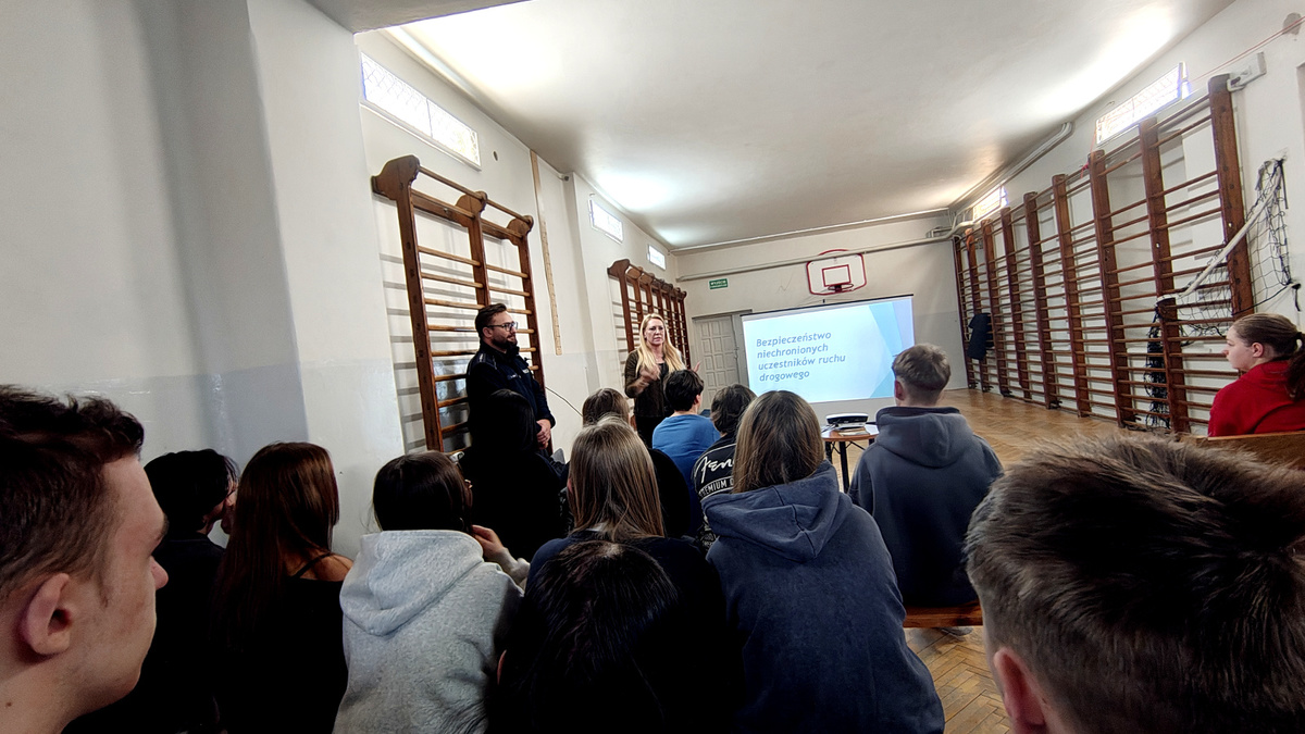 02 grudnia 2025 roku asp. Łukasz Kafar oraz p. Dagmara Rykaczewska przeprowadzili zajęcia, których celem było przypomnienie i utrwalenie zasad bezpiecznego poruszania się po drogach, zarówno jako pieszy, rowerzysta czy użytkownik hulajnogi elektrycznej. Podczas prelekcji omówiono szereg istotnych tematów, które mają wpływ na codzienne bezpieczeństwo uczestników ruchu drogowego. Uczniowie przypomnieli sobie, kim jest niechroniony uczestnik ruchu oraz dlaczego ta grupa jest szczególnie narażona na skutki wypadków. Zwrócono uwagę na konieczność zachowania ostrożności i przewidywania potencjalnych zagrożeń. Omówiono przepisy dotyczące korzystania z hulajnóg elektrycznych oraz jakie zachowania zapewniają bezpieczeństwo zarówno użytkownikowi, jak i innym uczestnikom ruchu. Przedstawiciele służb podkreślili, jak istotne jest noszenie odblasków, zwłaszcza po zmroku i w warunkach ograniczonej widoczności. Dzięki nim pieszy czy rowerzysta staje się widoczny dla kierowcy nawet z kilkuset metrów. Uczniowie dowiedzieli się, czym różni się droga hamowania od drogi zatrzymania pojazdu oraz jak ważne jest uwzględnianie tych wartości przy ocenie sytuacji na drodze. Szczególną uwagę zwrócono na konieczność odkładania telefonów i zdejmowania słuchawek podczas przechodzenia przez jezdnię. Krótka chwila nieuwagi może prowadzić do poważnych konsekwencji. Uczniowie mieli okazję skonfrontować swoją wiedzę z praktycznymi wskazówkami funkcjonariusza policji i specjalisty z WORD, a zdobyta wiedza z pewnością przyczyni się do zwiększenia ich bezpieczeństwa.