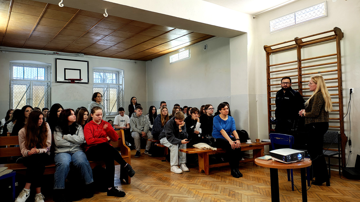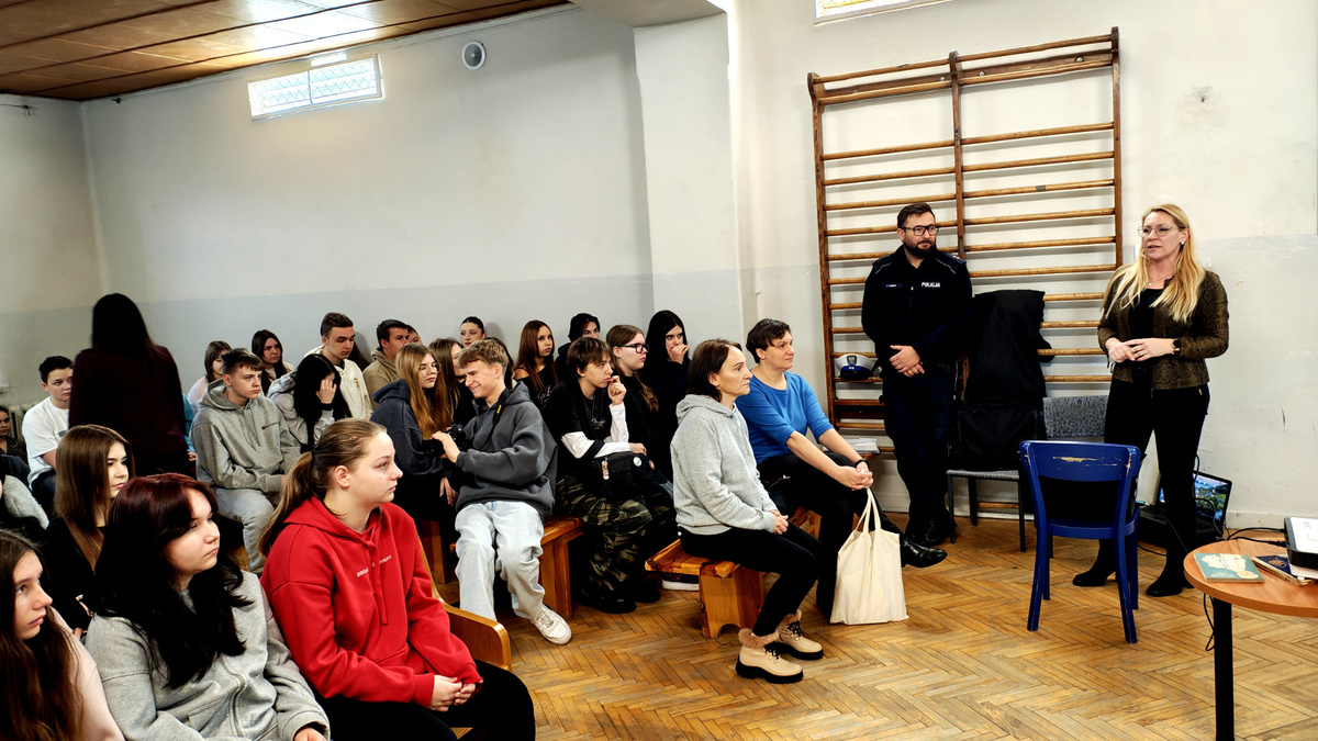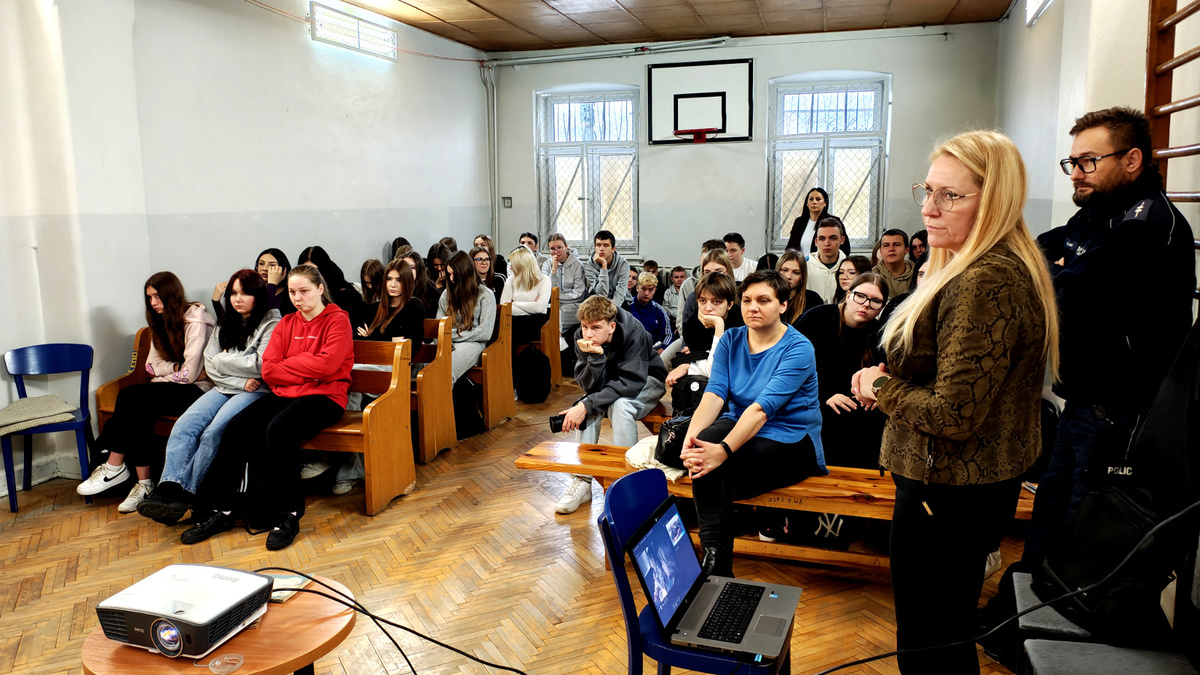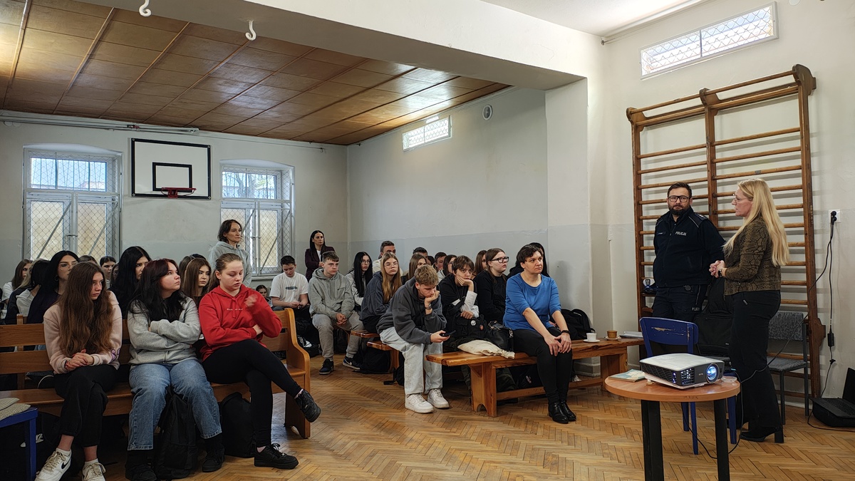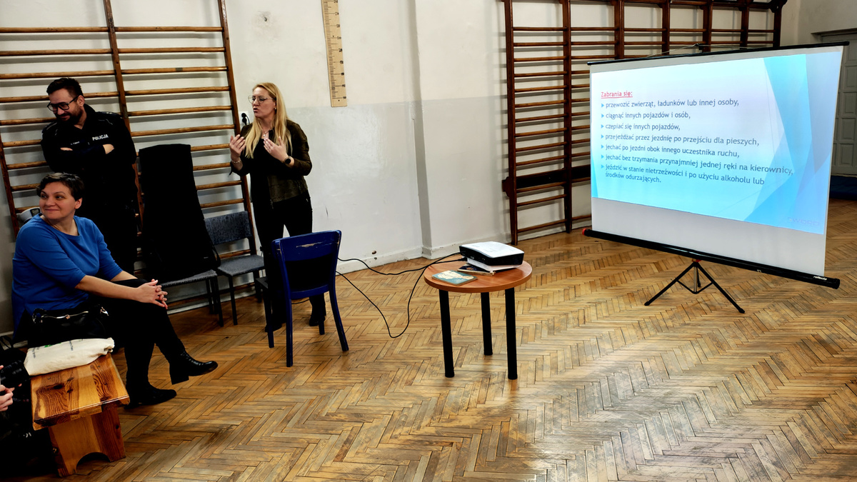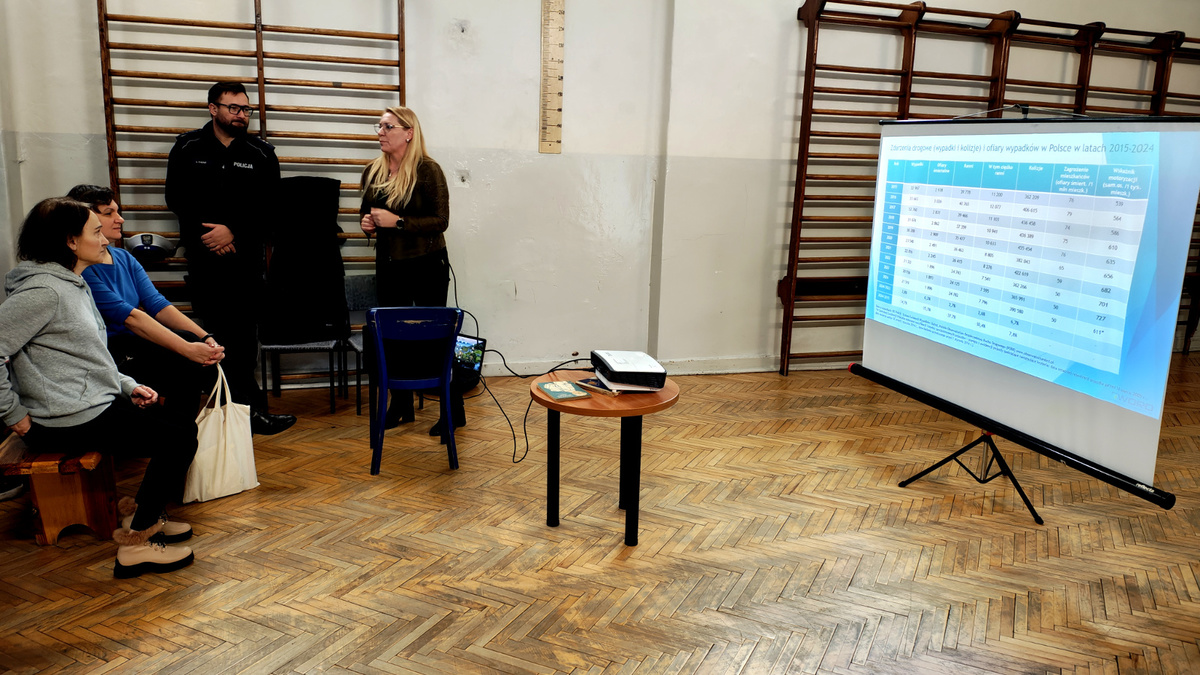 02 grudnia 2025 roku asp. Łukasz Kafar oraz p. Dagmara Rykaczewska przeprowadzili zajęcia, których celem było przypomnienie i utrwalenie zasad bezpiecznego poruszania się po drogach, zarówno jako pieszy, rowerzysta czy użytkownik hulajnogi elektrycznej. Podczas prelekcji omówiono szereg istotnych tematów, które mają wpływ na codzienne bezpieczeństwo uczestników ruchu drogowego. Uczniowie przypomnieli sobie, kim jest niechroniony uczestnik ruchu oraz dlaczego ta grupa jest szczególnie narażona na skutki wypadków. Zwrócono uwagę na konieczność zachowania ostrożności i przewidywania potencjalnych zagrożeń. Omówiono przepisy dotyczące korzystania z hulajnóg elektrycznych oraz jakie zachowania zapewniają bezpieczeństwo zarówno użytkownikowi, jak i innym uczestnikom ruchu. Przedstawiciele służb podkreślili, jak istotne jest noszenie odblasków, zwłaszcza po zmroku i w warunkach ograniczonej widoczności. Dzięki nim pieszy czy rowerzysta staje się widoczny dla kierowcy nawet z kilkuset metrów. Uczniowie dowiedzieli się, czym różni się droga hamowania od drogi zatrzymania pojazdu oraz jak ważne jest uwzględnianie tych wartości przy ocenie sytuacji na drodze. Szczególną uwagę zwrócono na konieczność odkładania telefonów i zdejmowania słuchawek podczas przechodzenia przez jezdnię. Krótka chwila nieuwagi może prowadzić do poważnych konsekwencji. Uczniowie mieli okazję skonfrontować swoją wiedzę z praktycznymi wskazówkami funkcjonariusza policji i specjalisty z WORD, a zdobyta wiedza z pewnością przyczyni się do zwiększenia ich bezpieczeństwa.