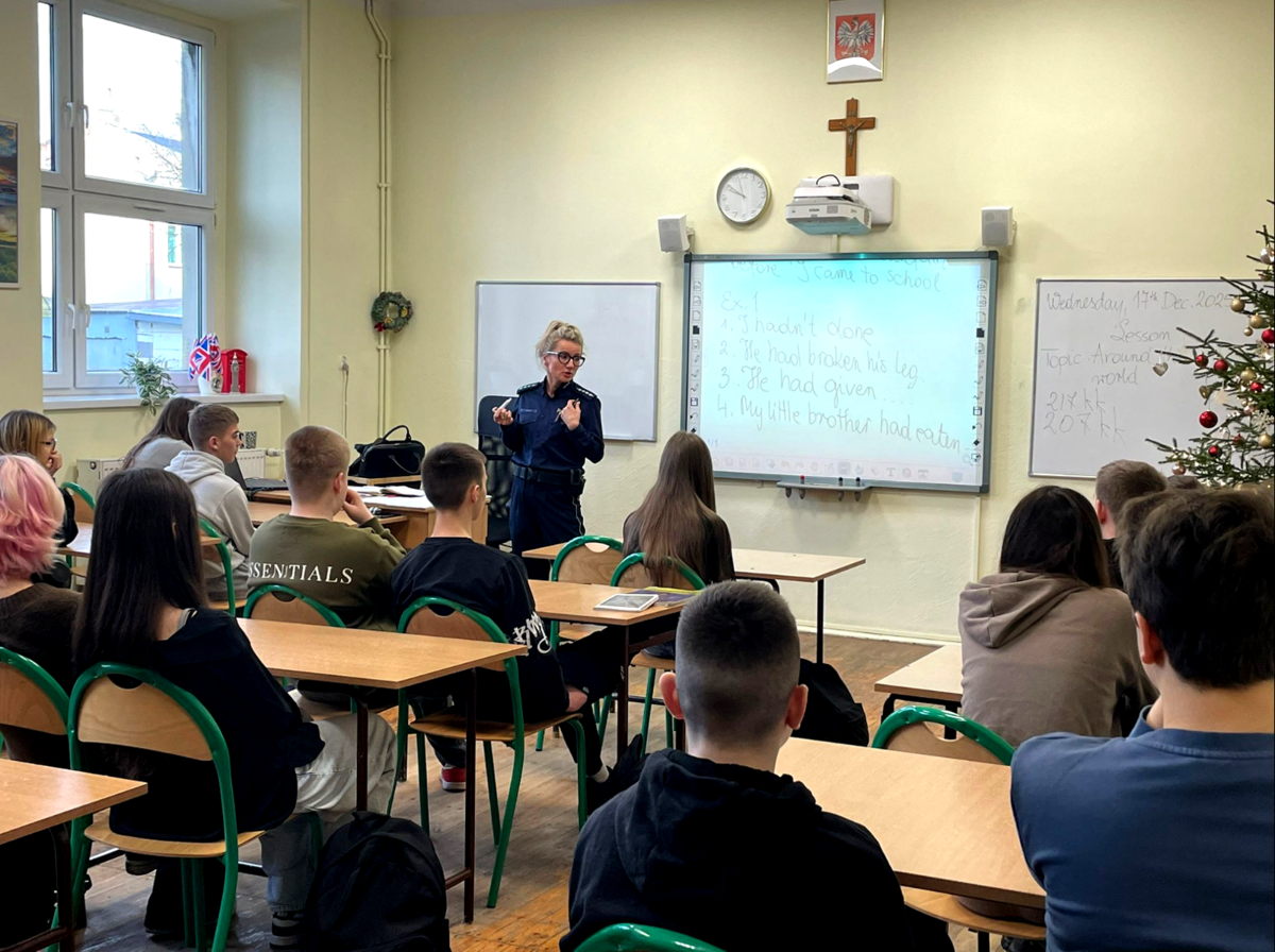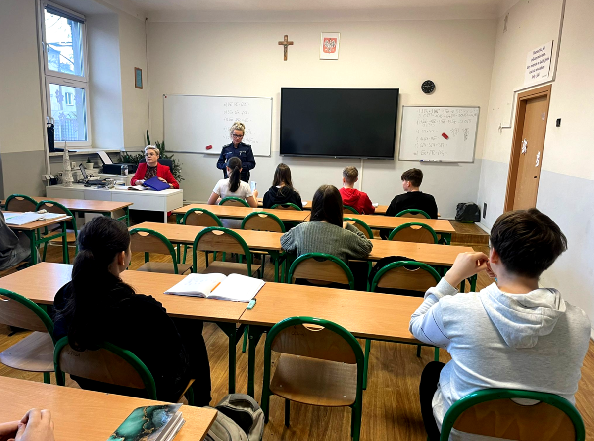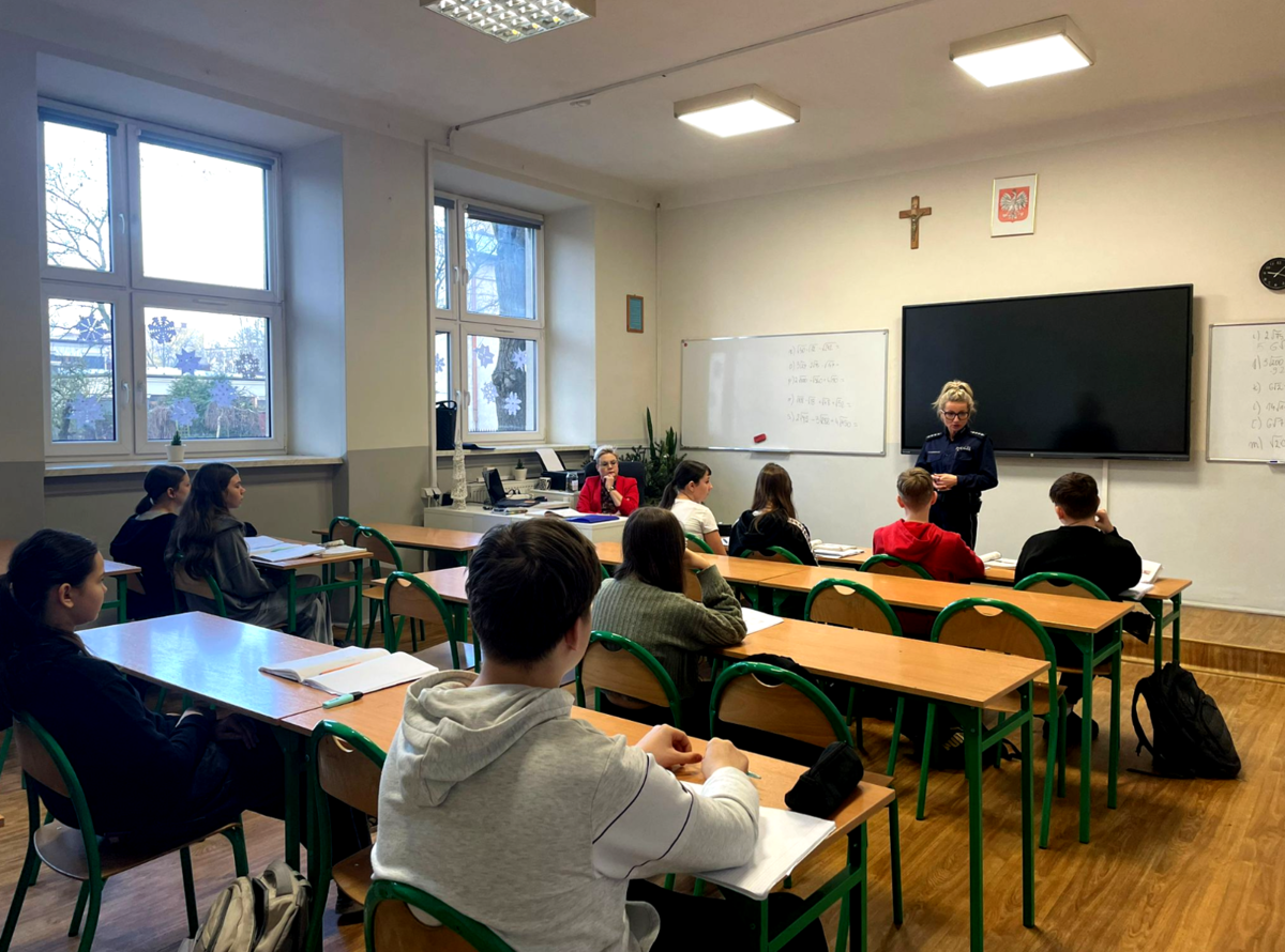 Funkcjonariuszka z Zespołu ds. profilaktyki społecznej przeprowadziła pogadankę profilaktyczną z uczniami 11-tki, dotyczącą hejtu, mowy nienawiści oraz przemocy rówieśniczej. Spotkanie miało na celu zwiększenie świadomości młodzieży na temat konsekwencji takich zachowań oraz promowanie postaw opartych na szacunku i empatii.