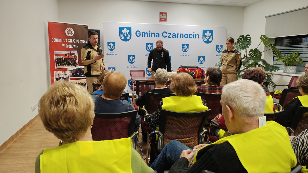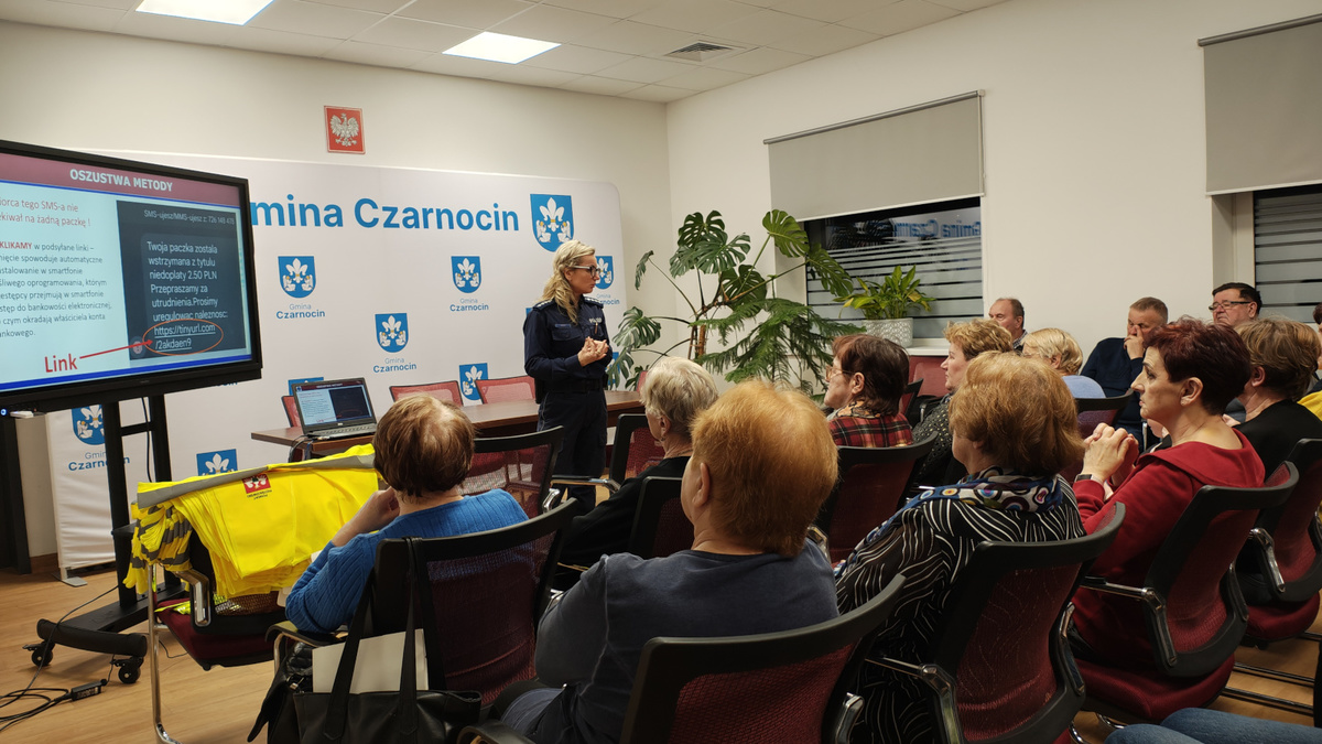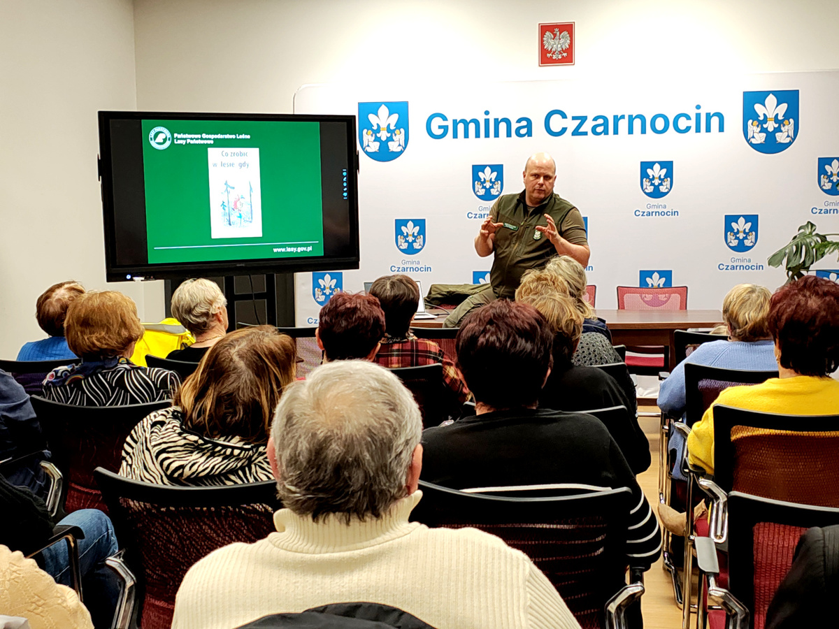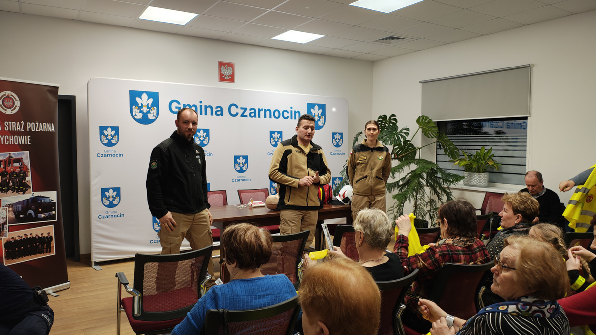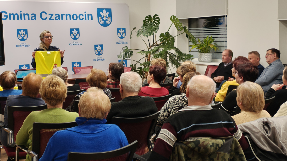27 stycznia 2026 roku z okazji Dnia Babci i Dziadka postanowiliśmy zadbać o bezpieczeństwo seniorów mieszkających na terenie gminy Czarnocin. W budynku Ekosfery zorganizowano spotkanie podczas którego prelekcje wygłosili asp. szt. Katarzyna Dębińska z Komendy Miejskiej Policji w Piotrkowie Trybunalskim, starszy strażnik leśny Rafał Taranowski z Nadleśnictwa Piotrków oraz druhowie Ochotniczej Straży Pożarnej w Tychowie. Podczas spotkania zwrócono szczególną uwagę na zagrożenia związane z oszustwami metodą na wnuczka czy pracownika socjalnego. Policjantka przypomniała także zasady noszenia elementów odblaskowych. Nie zabrakło również informacji na temat bezpiecznego zachowania w lasach i na terenach zielonych, które omówił przedstawiciel Nadleśnictwa. Druhowie zaprezentowali natomiast zasady udzielania pierwszej pomocy oraz reagowania w sytuacjach kryzysowych. Zachęcali zgromadzonych seniorów do zakupu czujników czadu czy gazu, dzięki którym mogą ocalić swoje życie. Na zakończenie spotkania każdy z uczestników otrzymał opaski oraz kamizelki odblaskowe, ufundowane przez Starostę Powiatu Piotrkowskiego, które mają na celu poprawę widoczności i bezpieczeństwa seniorów, szczególnie po zmroku. Strażnik leśny zachęcał zgromadzonych do zakładania otrzymanych odblasków również na wycieczki do lasu, ponieważ w razie zaginięcia będą lepiej widoczni, co ułatwi ewentualne poszukiwania.