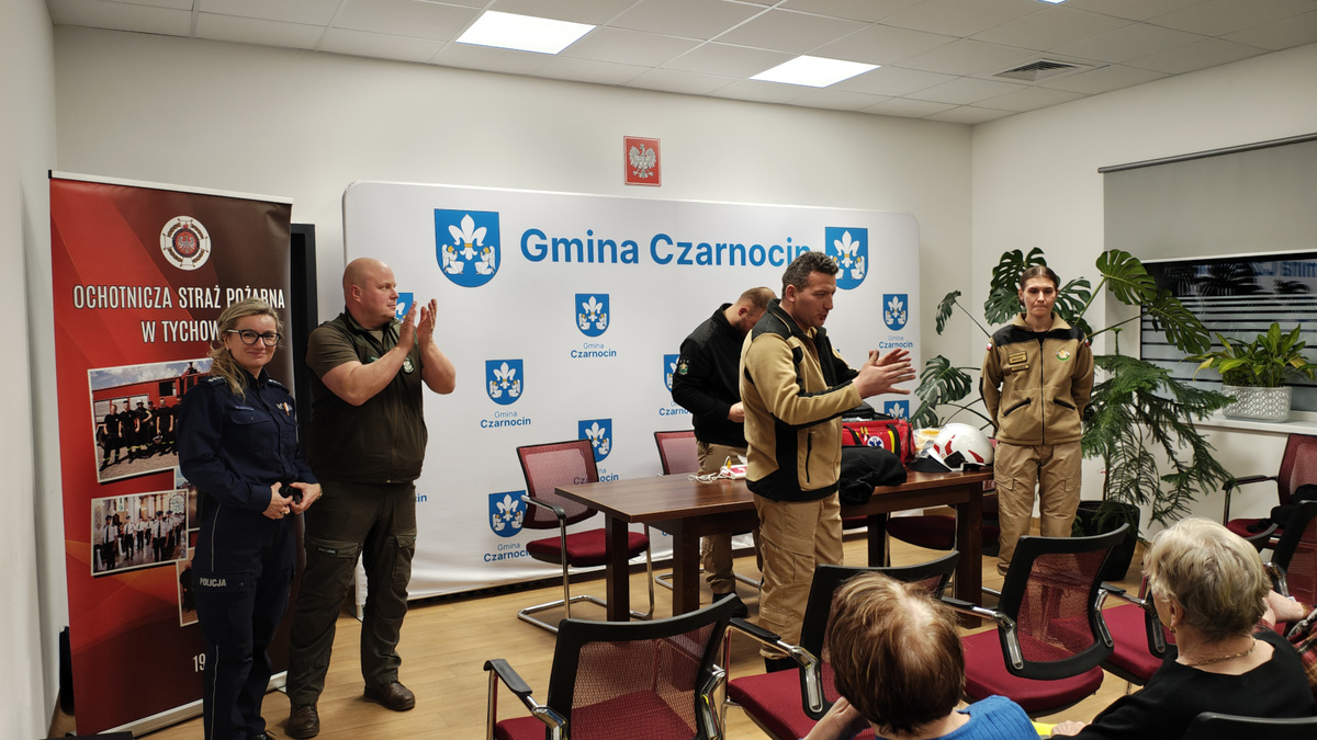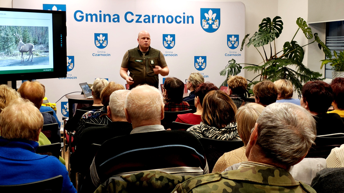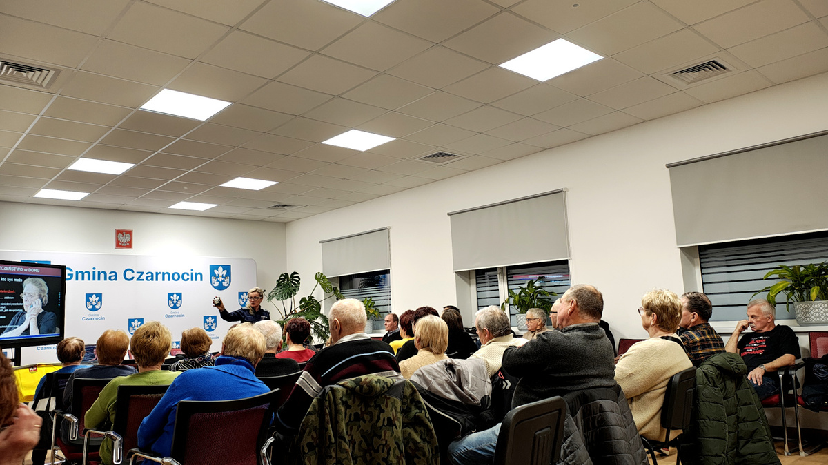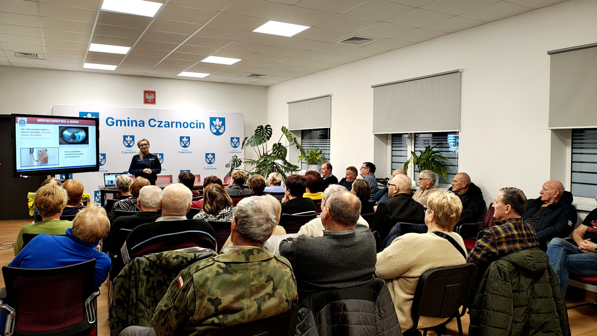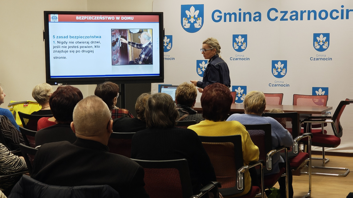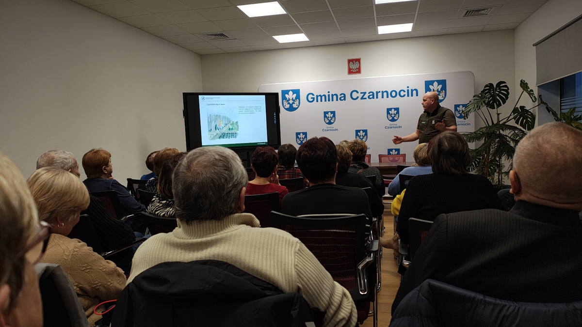 27 stycznia 2026 roku z okazji Dnia Babci i Dziadka postanowiliśmy zadbać o bezpieczeństwo seniorów mieszkających na terenie gminy Czarnocin. W budynku Ekosfery zorganizowano spotkanie podczas którego prelekcje wygłosili asp. szt. Katarzyna Dębińska z Komendy Miejskiej Policji w Piotrkowie Trybunalskim, starszy strażnik leśny Rafał Taranowski z Nadleśnictwa Piotrków oraz druhowie Ochotniczej Straży Pożarnej w Tychowie. Podczas spotkania zwrócono szczególną uwagę na zagrożenia związane z oszustwami metodą na wnuczka czy pracownika socjalnego. Policjantka przypomniała także zasady noszenia elementów odblaskowych. Nie zabrakło również informacji na temat bezpiecznego zachowania w lasach i na terenach zielonych, które omówił przedstawiciel Nadleśnictwa. Druhowie zaprezentowali natomiast zasady udzielania pierwszej pomocy oraz reagowania w sytuacjach kryzysowych. Zachęcali zgromadzonych seniorów do zakupu czujników czadu czy gazu, dzięki którym mogą ocalić swoje życie. Na zakończenie spotkania każdy z uczestników otrzymał opaski oraz kamizelki odblaskowe, ufundowane przez Starostę Powiatu Piotrkowskiego, które mają na celu poprawę widoczności i bezpieczeństwa seniorów, szczególnie po zmroku. Strażnik leśny zachęcał zgromadzonych do zakładania otrzymanych odblasków również na wycieczki do lasu, ponieważ w razie zaginięcia będą lepiej widoczni, co ułatwi ewentualne poszukiwania.