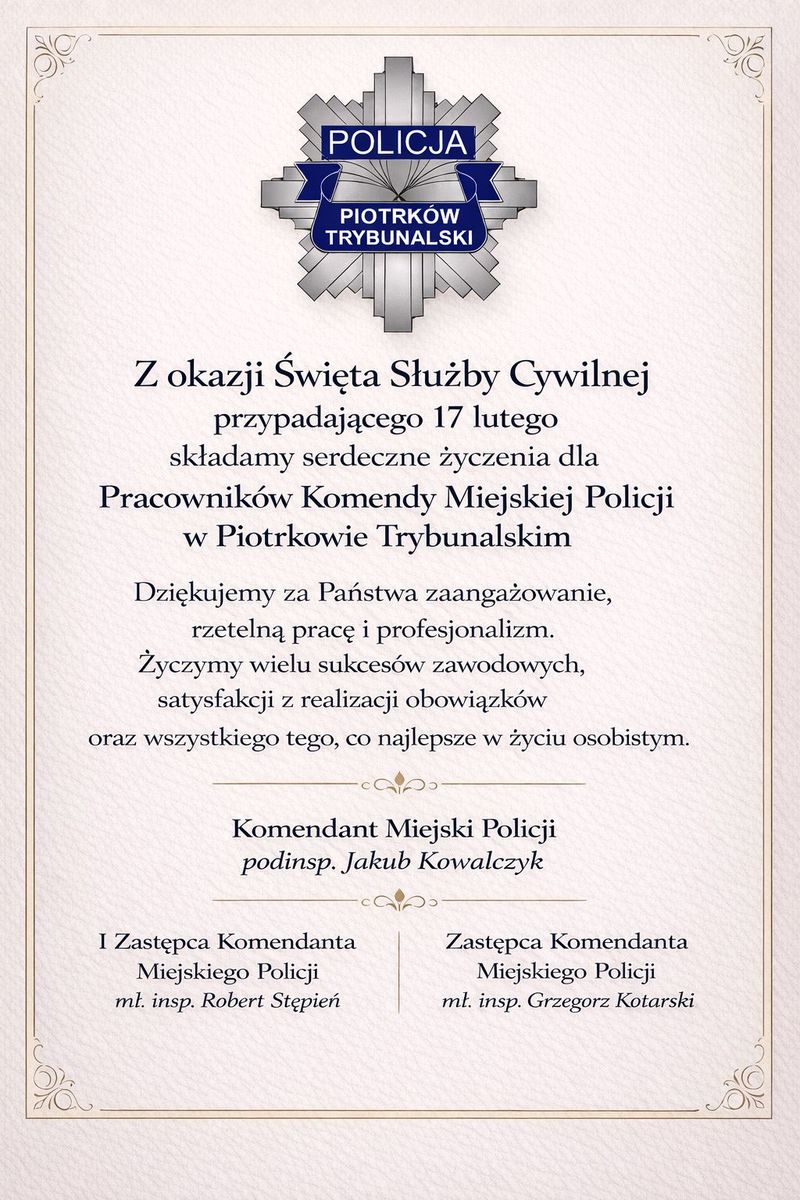 Z okazji Święta Służby Cywilnej Komendant Miejski Policji w Piotrkowie Trybunalskim podinspektor Jakub Kowalczyk, I Zastępca Komendanta Miejskiego Policji w Piotrkowie Trybunalskim młodszy inspektor Robert Stępień oraz Zastępca Komendanta Miejskiego Policji w Piotrkowie Trybunalskim młodszy inspektor Grzegorz Kotarski składają serdeczne życzenia dla Pracowników Komendy Miejskiej Policji w Piotrkowie Trybunalskim.